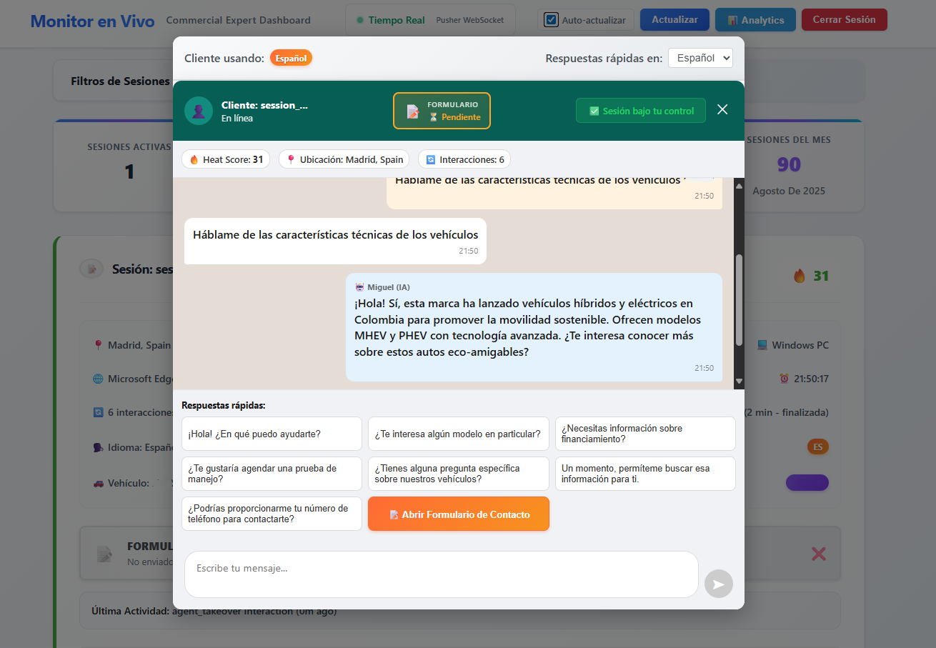Asistente IA consultivo + 3D/360°, generación y scoring de leads, panel en vivo para asesores y Sales Intelligence.